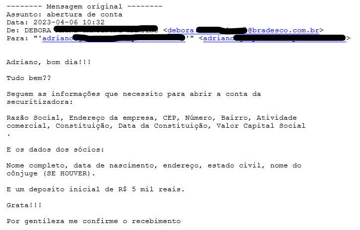 Aqui está um exemplo prático de um email trocado entre um de nossos clientes e o Bradesco: